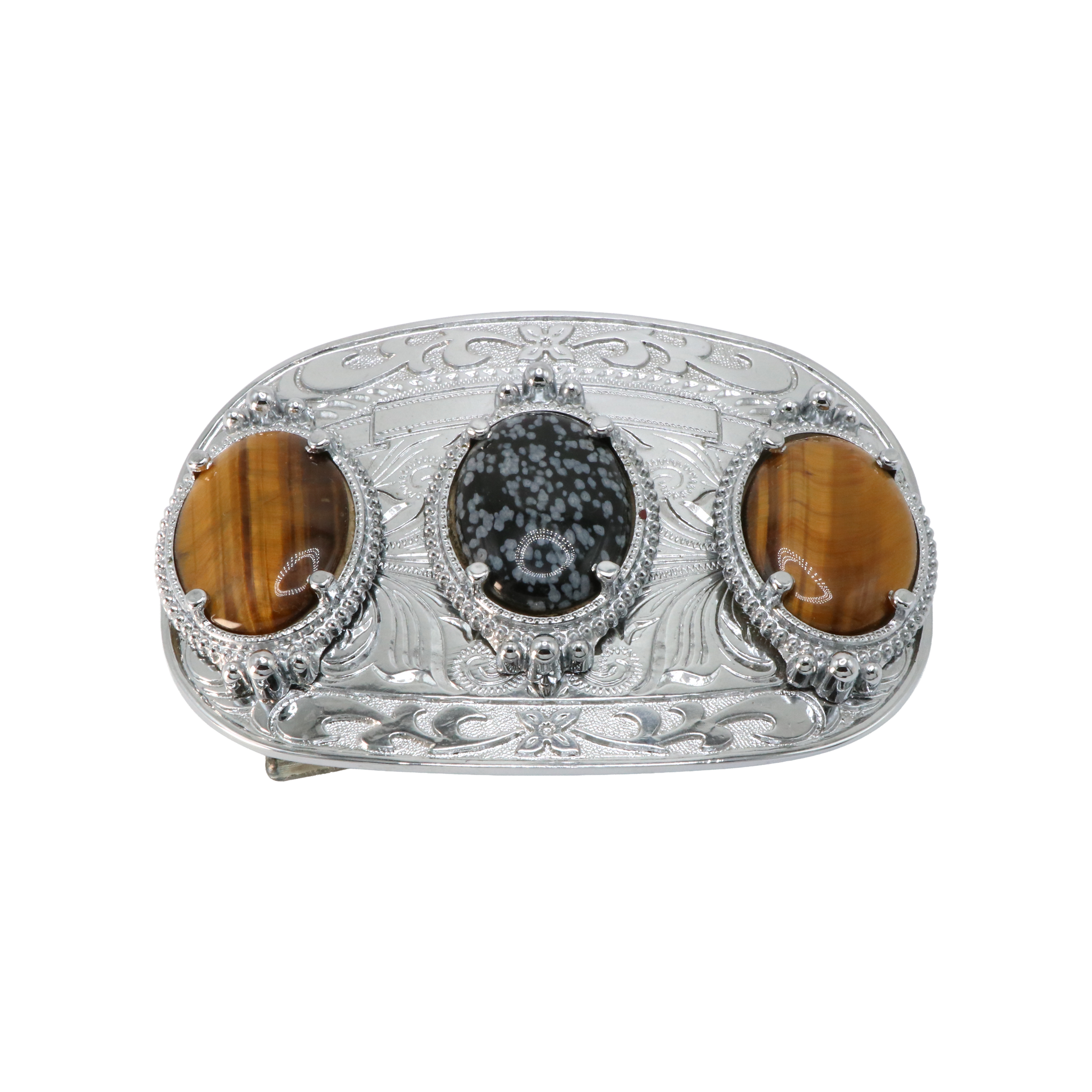 Stones: Genuine Tigers Eye & Obsidian GemstonesMaterial: MetalSize: 9.5x7 cmStone Size: 2.25x3 cm